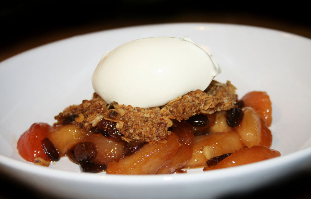 To assemble the crumble , firstly spoon out a layer of Berries , add some cooking juices over the berries.Top this with a spoonful of caramelised apples. Carefully lift off a piece of the crumble mixture and top off with a quenelle of creme fraiche.( The crumble definitely needs the creme fraiche because its so sweet )
