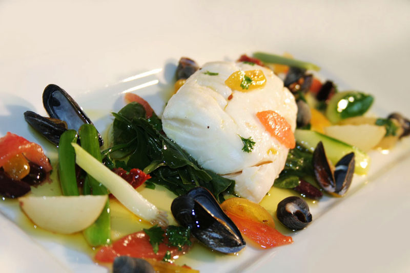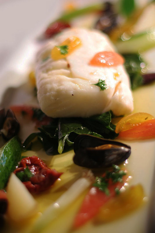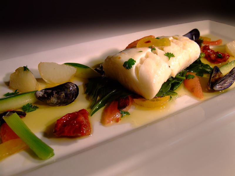 Enough of the scenery and on to the food , cooking a half healthy meal from a few bits n pieces. I trimmed the codling up neatly and decided to simply steam it over a scented stock made from Celery , Parsley stalks , and a splash of white wine.That was going to take about six minutes and i also cooked the mussels and cuvvins in the stock while the fish was steaming above.Halfway through the cooking time i added the Sea Beet to the steamer, three minutes was enough to wilt the leaves and keep a little bite as well as retaining the glorious green colour to the sea veg.