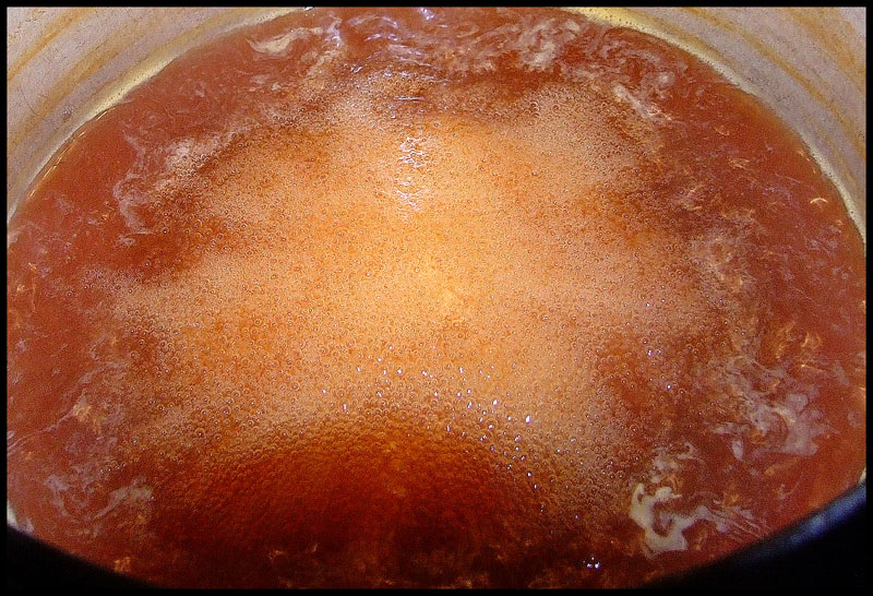 The Rosehip syrup reducing down and the flavours concentrating.I took some of the syrup out at this stage and sweetened it with sugar to taste.I then added gelatine and carefully poured it into the small shot glasses which were set at angles in old egg boxes.Once cooled down these jellys were allowed to set in the fridge for a couple of hours to keep their shape when they were straightened up again.