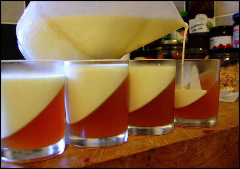 The cold Pannacotta mixture is carefully poured into the shot glasses and then replaced into the fridge to set for a few more hours or overnight before being topped with the Elderberry coulis.