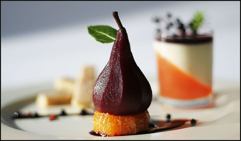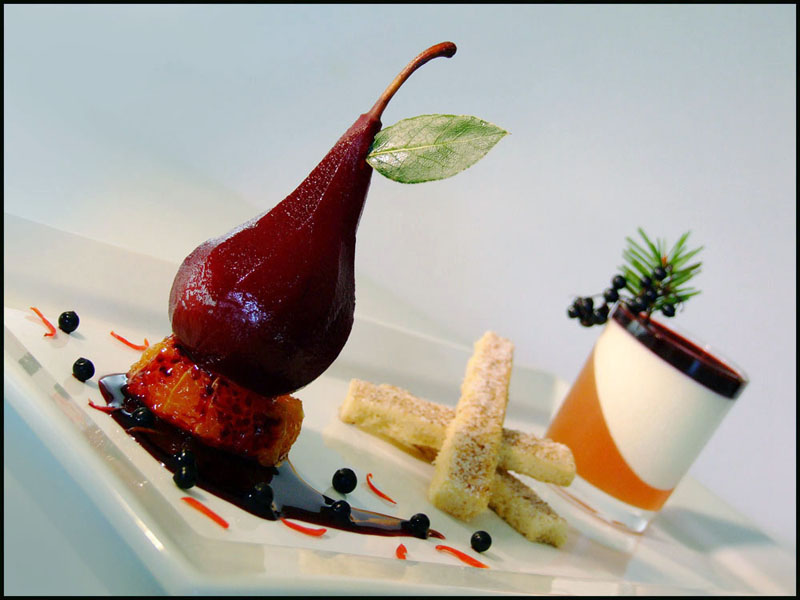 The remaining poaching syrup was put through a fine sieve and then reduced slowly down until a nice highly flavoured sticky syrup remained.This was allowed to cool.