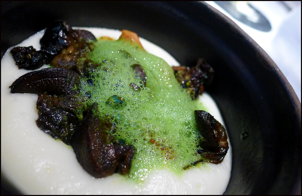 mushrooms , garlic and parsley ) ( £12 ) .Served in a small cast iron lidded cocotte pot , we knew they were on the way before they arrived at the table , the smell of good food filled the restaurant.The base of the pot contained a very delicate mousseline of potato , very light in texture and topped with tiny chanterelle mushrooms and the roasted snails.A highly aromatic sauce of butter , garlic and fresh parsley was spooned over the snails and served with a side of crispy garlic bread. Every mouthful was a