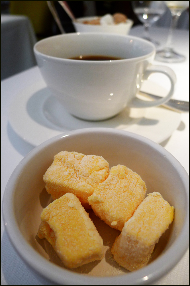 Little treats of what tasted like passion fruit marshmallow accompanied the well priced coffee (£3.50) …..and by then , we had well and truly topped up from the previous nights meal at Darroze….no more food….please.
