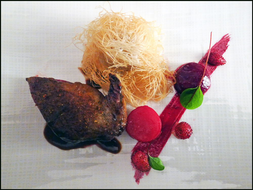 Pink roasted breast of Pigeon from Raclan flambeed “au Capucin” , glazed beetroots and wild strawberries from Malaga , intense sauce with “Mexican mole”