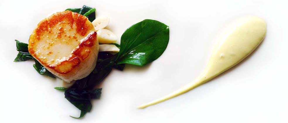 Seared Scottish scallop , Razorclams ,wild sea vegetables and Oyster emulsion.