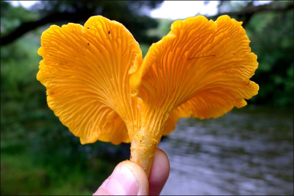 The orange coloured mushroom is the Chanterelle / Girolle , both names for the same mushroom.Highly prized , fantastic flavour , smells of Apricots , grows under beech , pine and chestnut trees , mossy banks and amongst leaf litter.It`s amazing with scrambled eggs ,butter and cream on toast….wow….and very easy to identify.