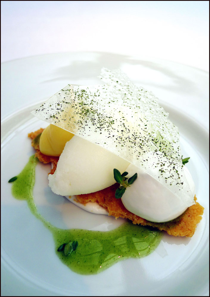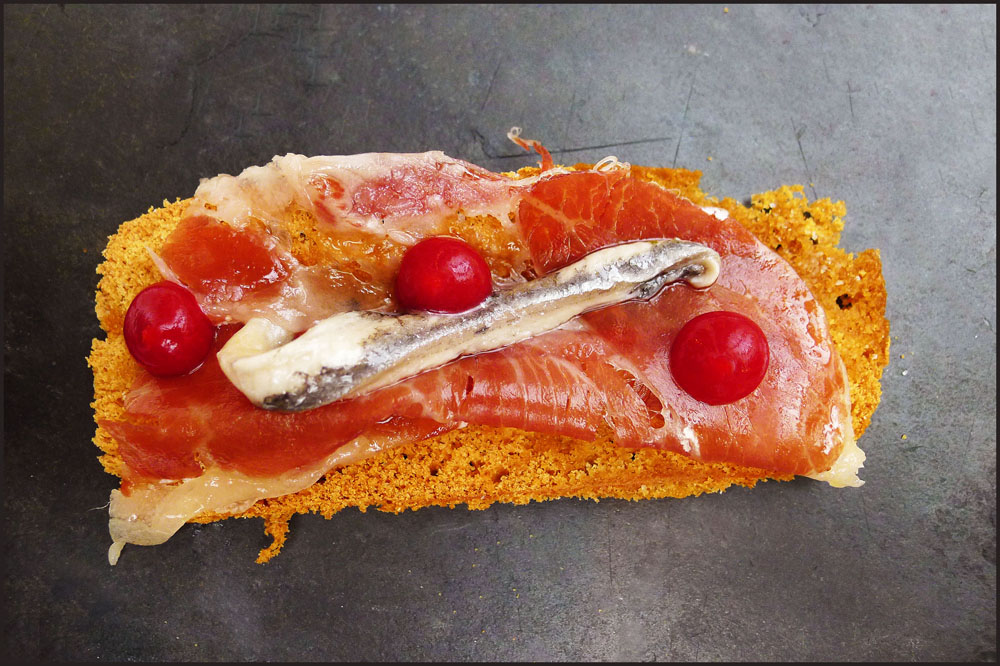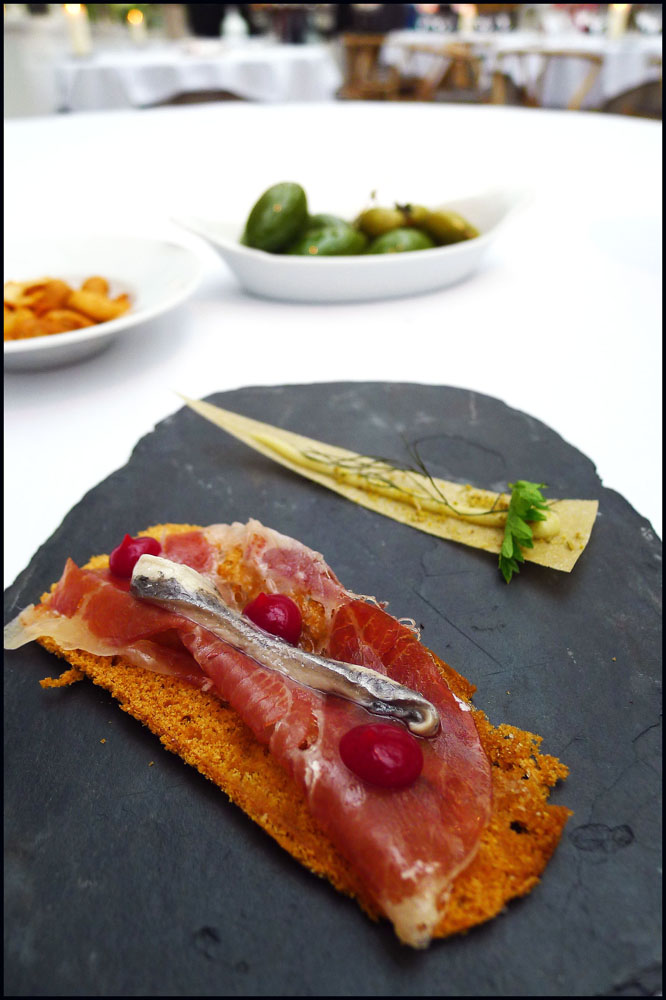 Green Olive and Green baby Peach / Salted and spiced / Fennel pollen caramel / Iberico , Pan con raspberry.