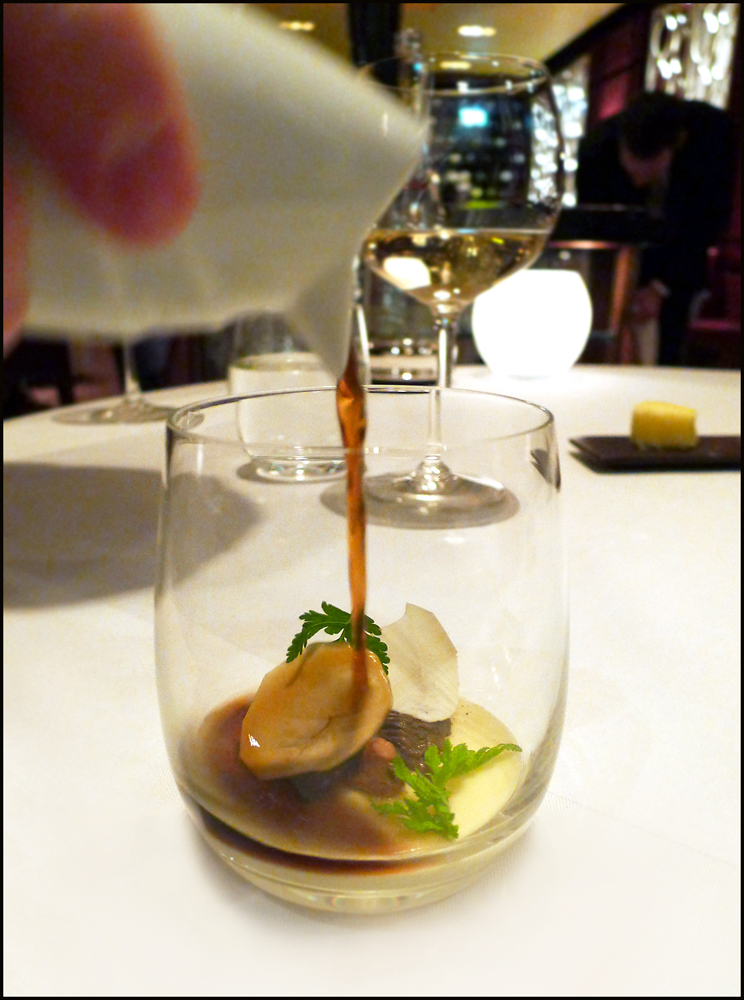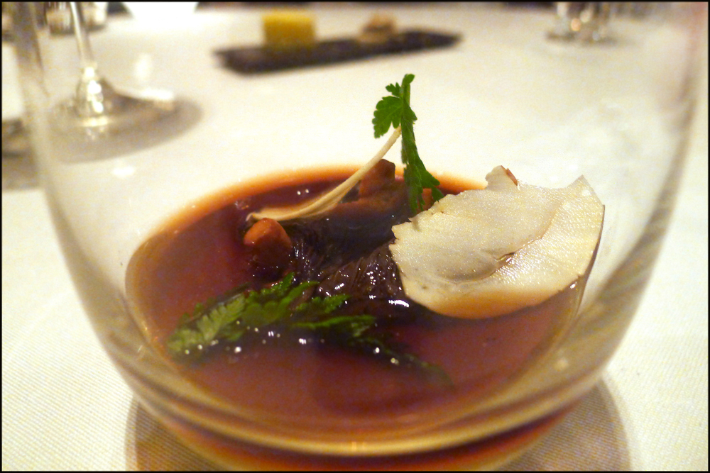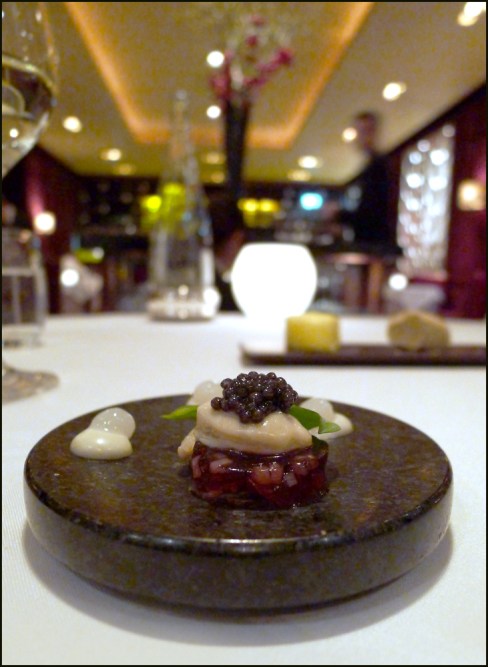 So same as last time , we turned up 3o minutes early and headed to the Berkeley “Blue bar”. It`s called that because…erm…its totally blue, infact the whole place really is painted blue. It`s very different. It`s a buzzy little bar , very popular during early evening and has an amazing list of cocktails that`s so long its impossible to start deciding what to drink.We both went for Champers cocktails , mine was served with Black raspberry liquor.The crazy Laird plumped for a fine Champagne remy XO with brown sugar cube. At 8.30 sharp we strolled through the hotel to the Marcus Wareing restaurant and straight away we were met by a little posse of staff , all smiles and handshakes “welcome back Mr Spedding , so pleased to see you here again”….wow , i was impressed.Their warm and very friendly greeting immediately setting the mood…i walked over to my table like a cock chicken, feeling like royalty….I knew that this was going to be another fantastic Berkeley experience.