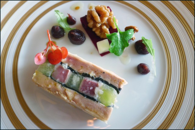 We were both seated in the far corner of the restaurant for lunch.It was the perfect place to take a nosey at all that was happening during service…probably best seats in the house if i`m honest.We both sat in silence taking everything in…we just didn`t need to speak , it was a case of The Ritz working its magic.Within a few minutes a little entourage of smartly dressed young waiters descended on our table “A complimentary starter from the chef”. My eyes lit up , i seen the wonderful terrine presented before me…generous slices of Goose foie gras sandwiching perfectly cooked cubes of Grouse breast and Granny smith apples interleaved with Black truffle….Oh Jeez…This is what fine dining is all about…what a treat. The restaurant was filling up pretty quickly with diners and with eyes like a hawk i immediately spotted two of them with cameras snapping away.I didn`t wait for a second before my Lumix was out and i joined them….what a rebel but at least i could get the beautiful food captured for all to see.