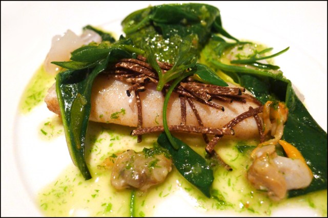 Grilled Plaice , Ink , Cuttlefish , Ricotta , Puntarella , Mojamo , Lardo.
