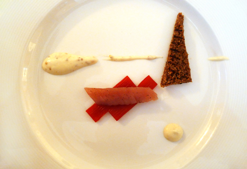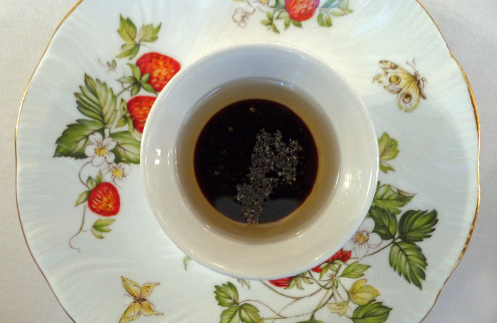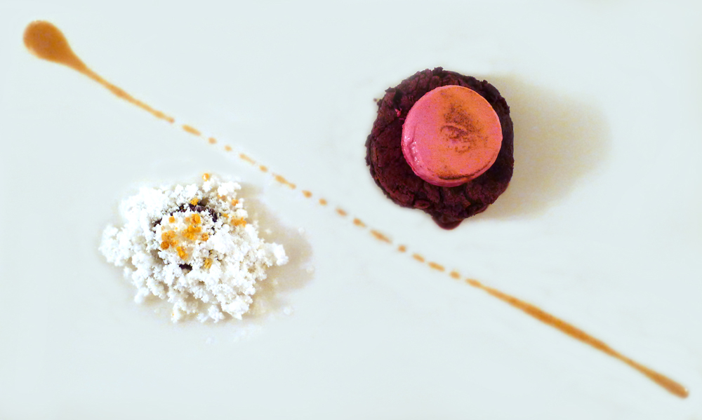 Beetroot & chocolate cake with beetroot marshmallow, caraway, hazelnut, heaton park honey & bee pollen Different….in a nice kinda way. Rich chocolate cake scented with what i thought was Dill ( i wasn`t far away with Caraway ) and a soft gooey marshmallow topping.I think the white powder was Hazelnut ice A very sweet dessert but it suited a sweet addict very well.