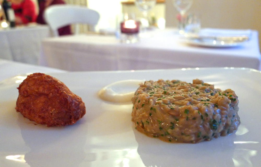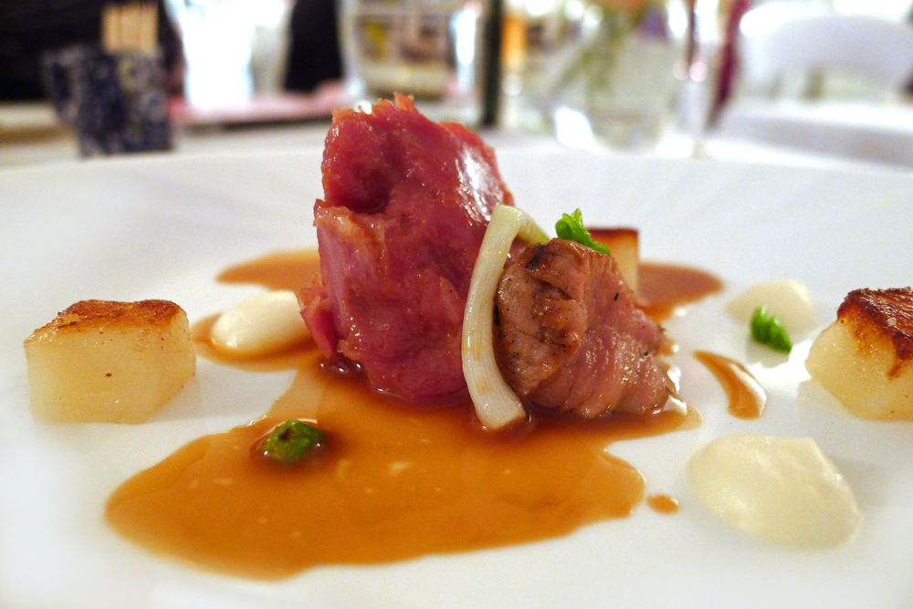 Cauliflower and Oat groat Porage , seared Grelots and Cauliflower beignet. Well it was certainly different , an unusual play on textures with the Porage.Personally i think it could be improved 100% with the addition of a skewer of seared chicken hearts / juices or something similar to add a meaty richness to the dish.
