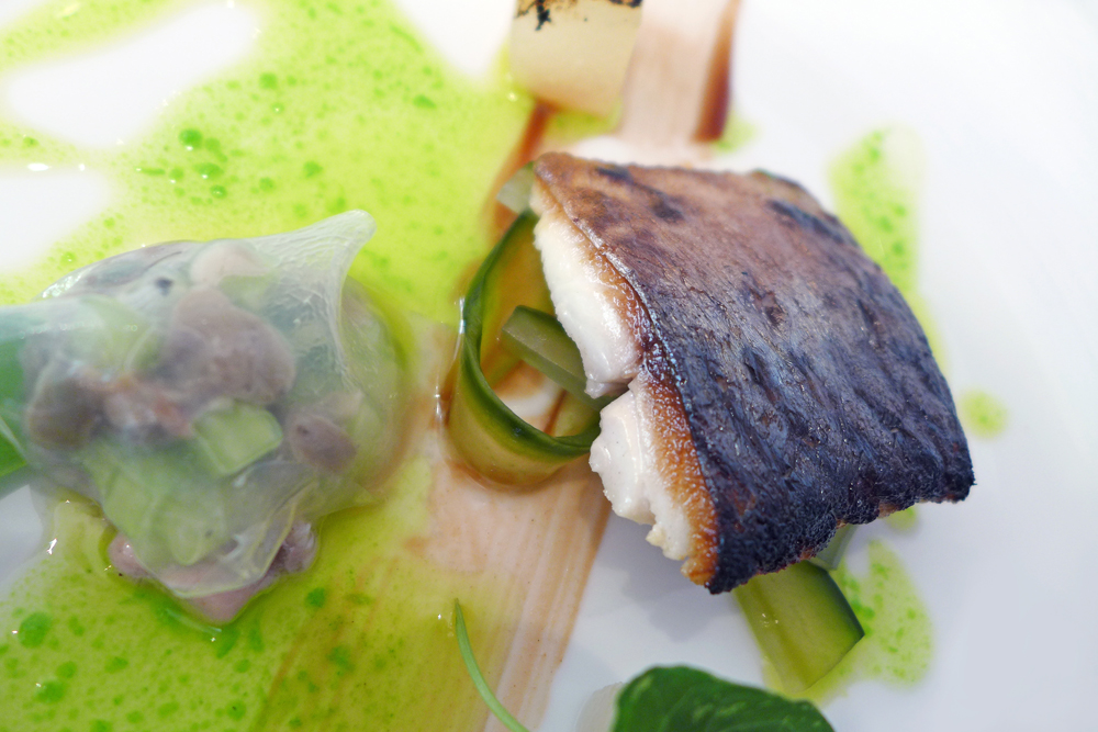 Pan fried Turbot , Squid pearls , Sea vegetables , Rice Royale set cream.