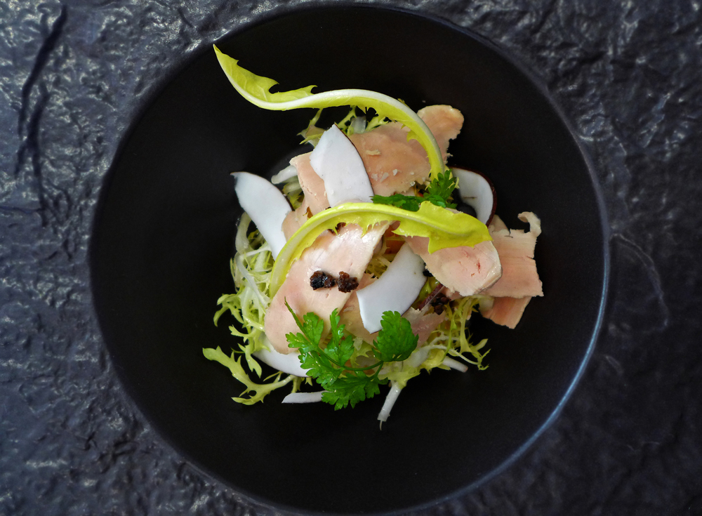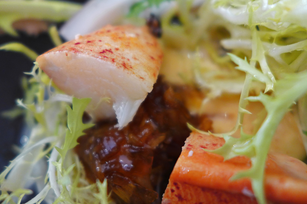 Foie Gras ribbons , Poached Lobster , Chicory Jam , Truffle essence and Coconut shavings.