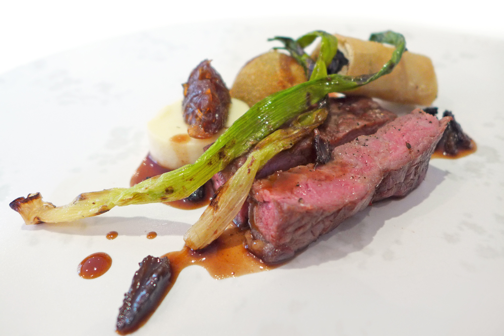 Twice cooked Rib eye , Snail cigar , Parsley bon bon , White onion panna cotta , Baby Morels , Red wine reduction.