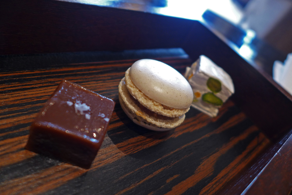 Chocolate salted fudge , Vanilla and caramel macaron , Pistachio Nougat.