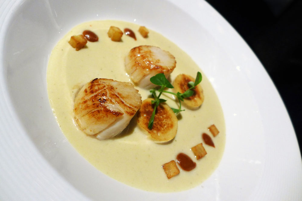Islay Scallops , Smoked Mackerel mousse , Caramelised Onion and Potato soup , Chorizo puree £ 12.95.
