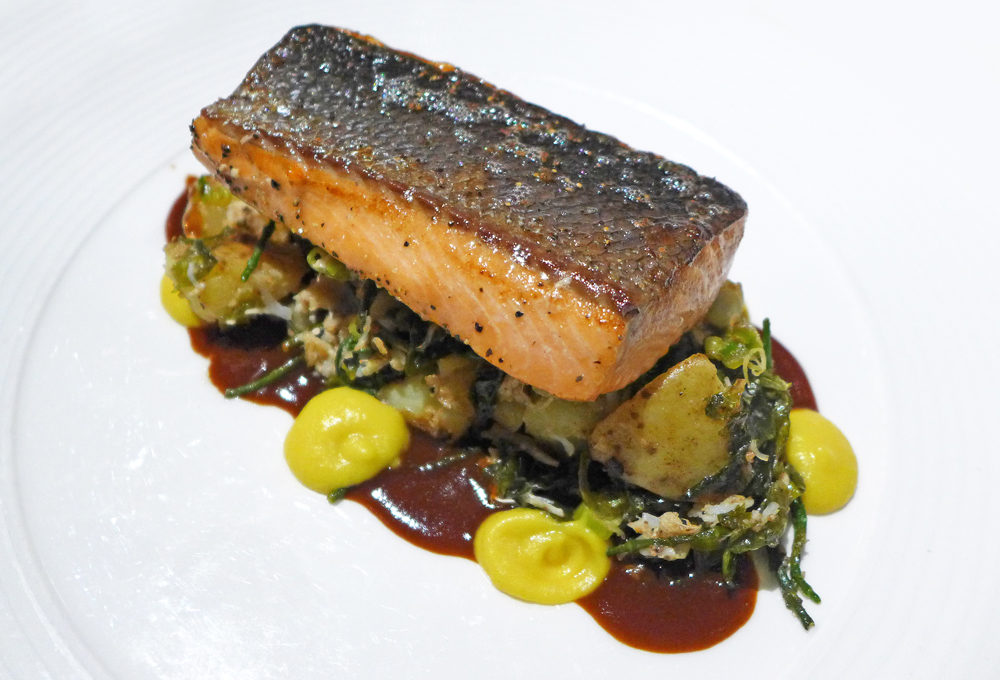 Grilled fillet of Organic Salmon , Crab crushed Ayrshire Potatoes , Sea vegetables , Corn puree and a Crab reduction £ 23.00ubiquitous chipubiquitous chip