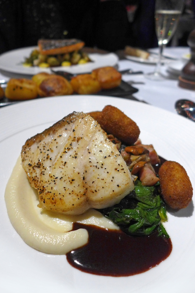 Pan fried Atlantic Halibut , crispy Oxtail , Wild Mushrooms , Pancetta , red wine and Chcolate sauce £ 26.50.