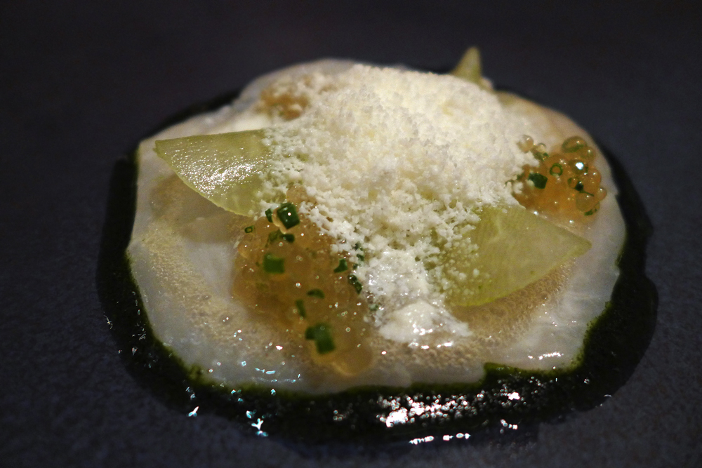 Ceviche of scallops with kohlrabi, seaweed and herb oil, frozen English Horseradish.
