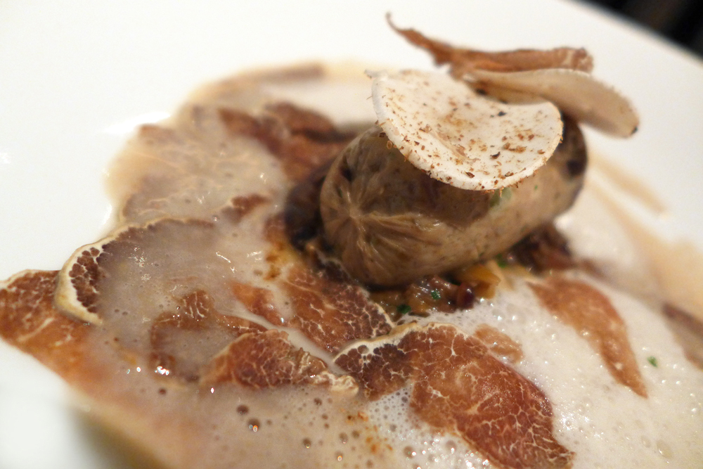 Boudin of wood pigeon and partridge with chestnut soup and veloute of white truffle