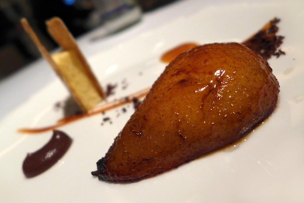 Pear cooked in brown butter with crispy porridge and walnut oil parfait