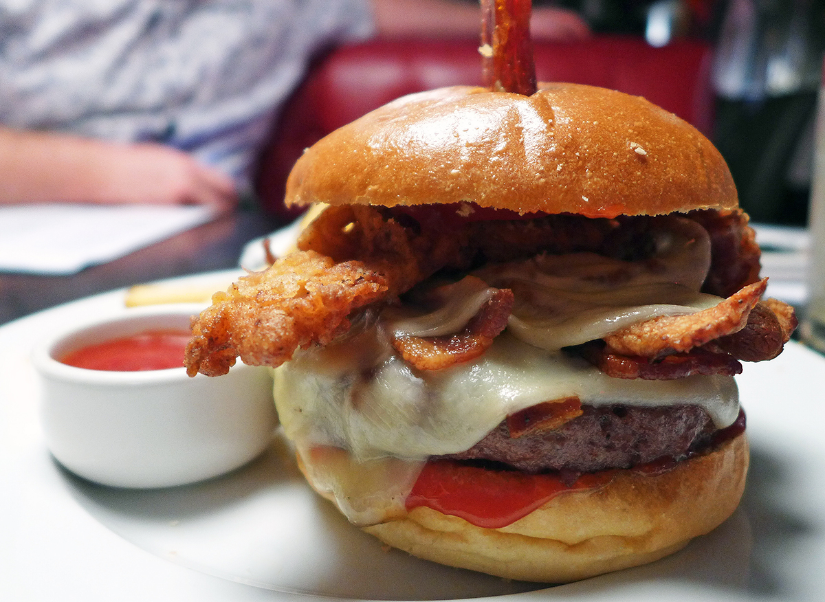 My well behaved `lightweight` son , Max went for the sensible option whilst the animals troughed beside him… He went for the Bacon Double Cheese burger with 4 ounces of Monterey Jack cheese, crispy Kentucky fried bacon , a toasted brioche bun and all held with a slice of bacon candy.