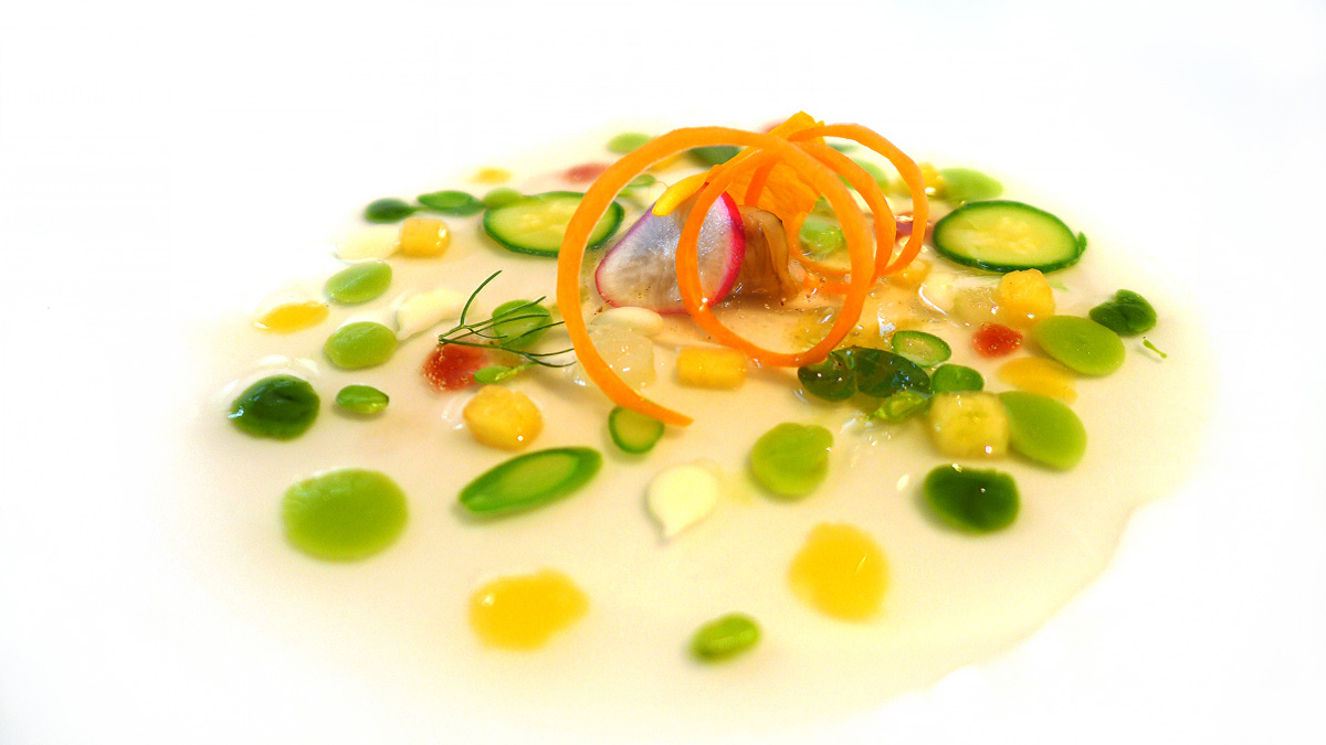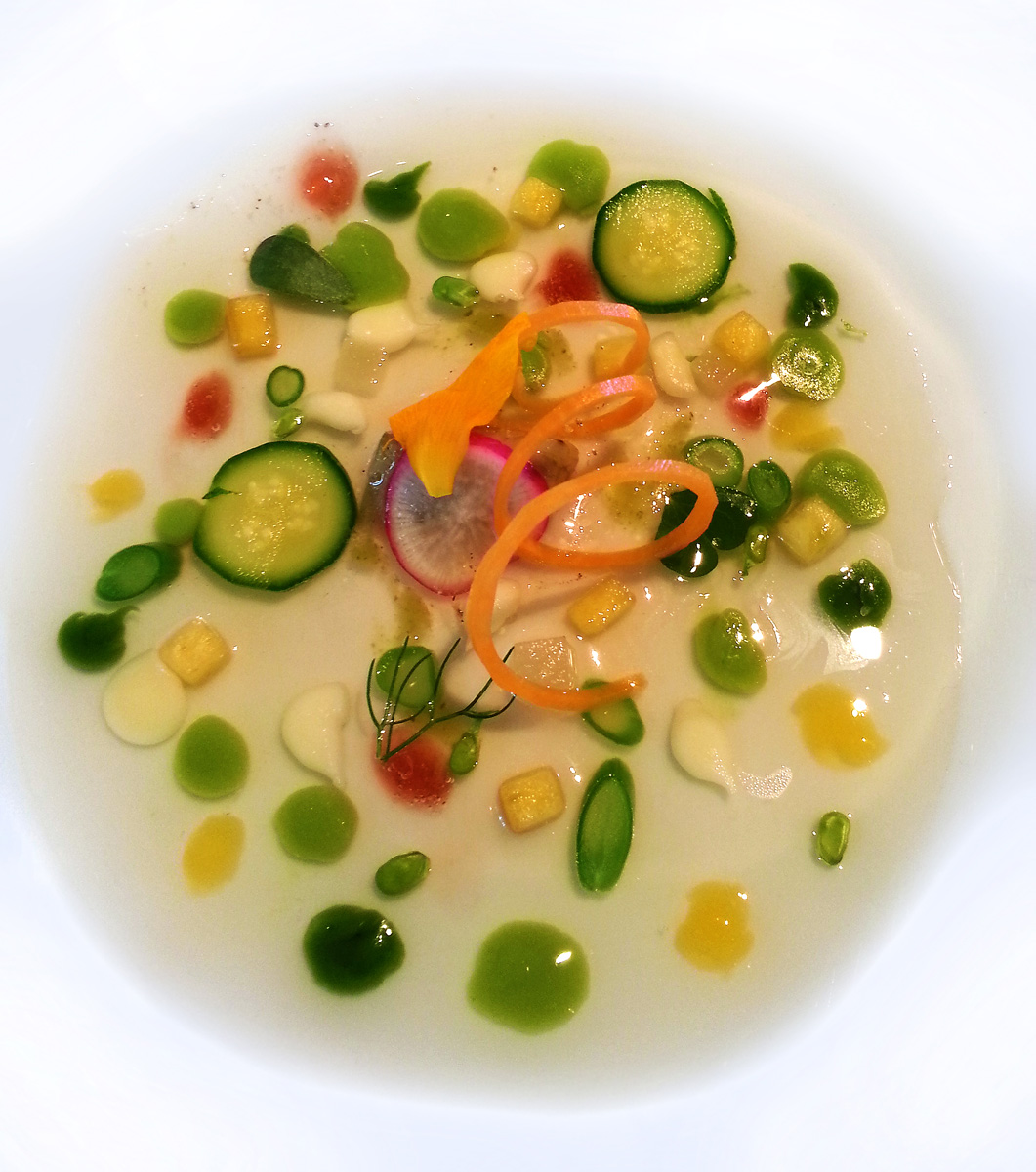 Vegetable stock with sprouts , flowers , leaves and fruits. – Very pretty , subtle and fresh flavours of Summer.