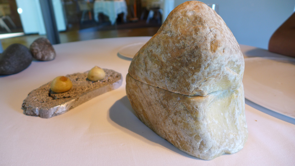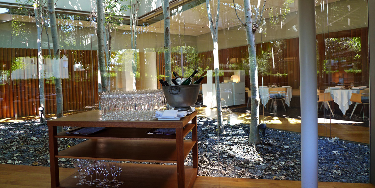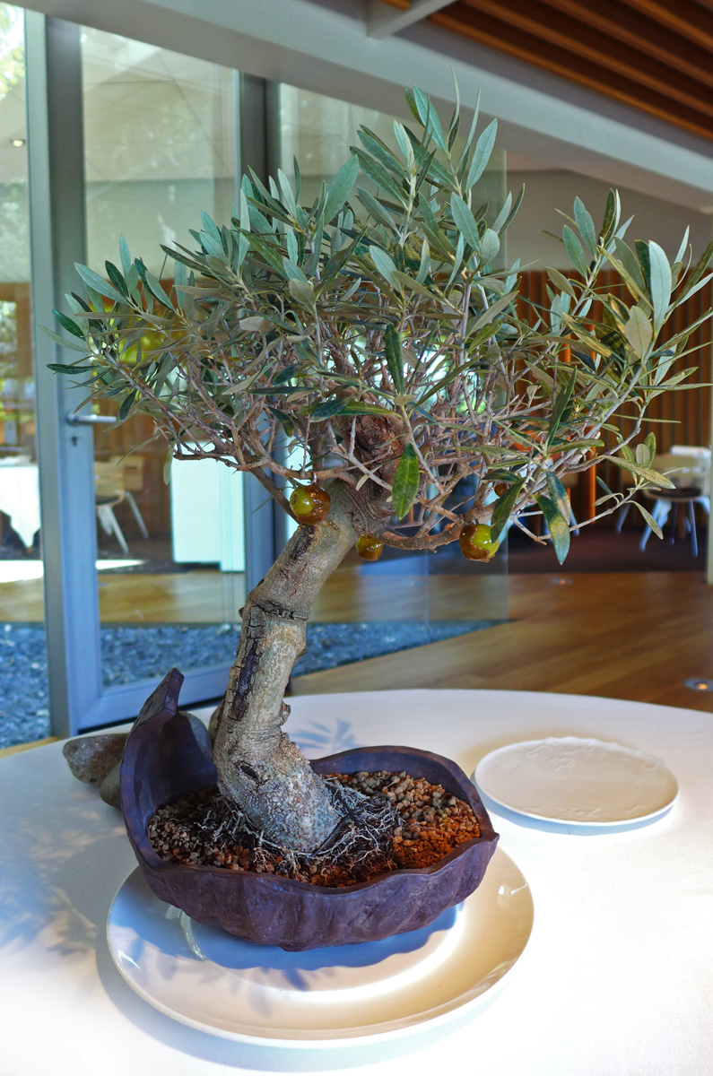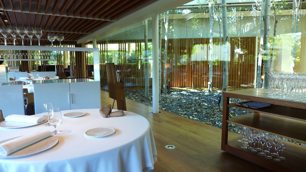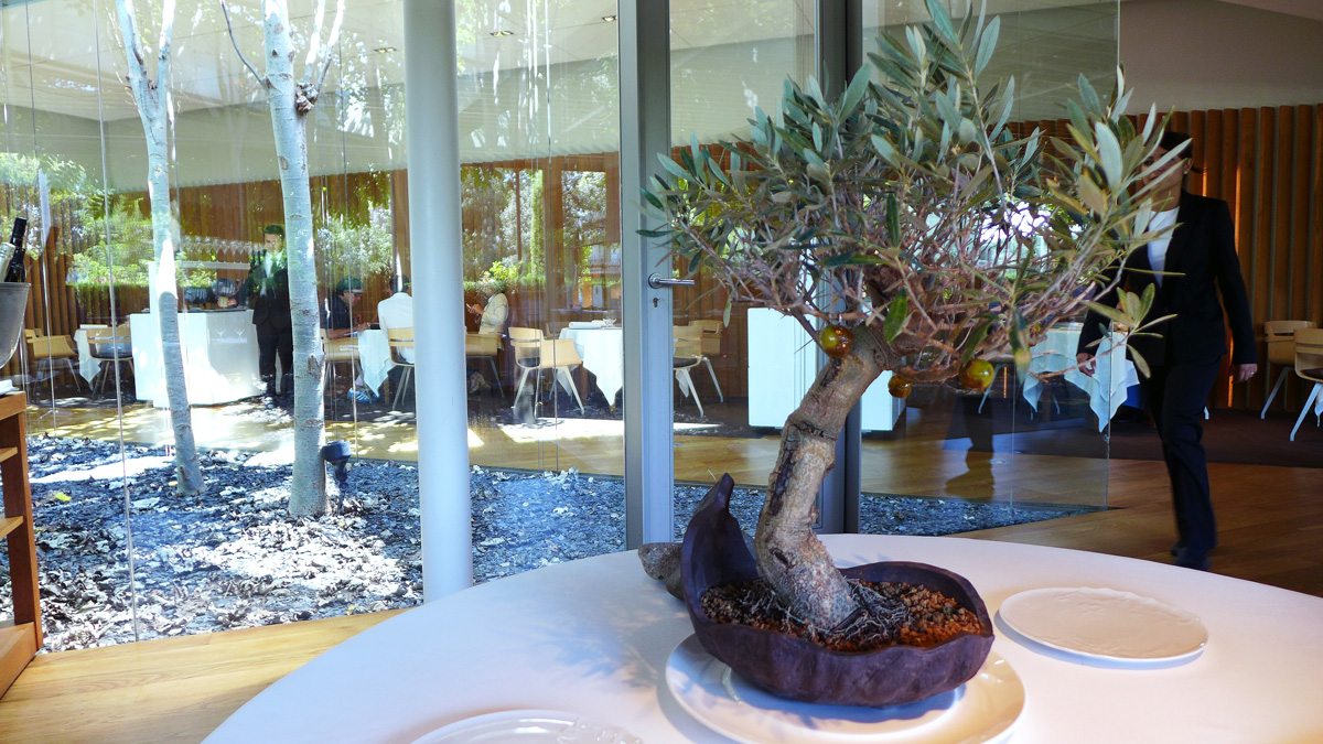 The first lunch tables are available at 1pm so i arrived early with my son Max for a look around the place and to settle in nicely. We were the only people in there apart from a camera crew so we chilled out on the big soft seating with an ice cold glass of house Cava . The whole of the premises are architecturally beautiful , a design masterpiece which extends to both the restaurant itself and the most high tech stunning kitchen ive ever laid eyes on. Huge glass walls , a mini plantation of what looked like silver Birch trees , Tunnels of pure White lead to the various areas of the restaurant and unique pieces of pottery and sculpture commissioned exclusively for the business. The whole set up is marvellous and the last thing one would expect to see in the middle of a residential area of Girona.