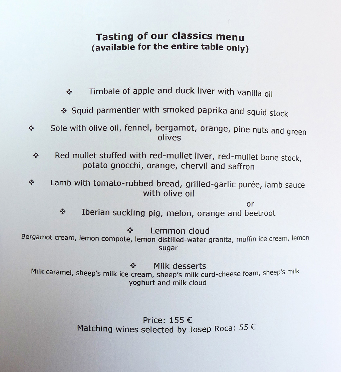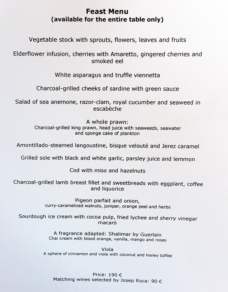 The Price – For an establishment carrying such an exclusive honour the cost of eating here is very reasonable indeed. There are 2 menus at Can Roca and therefore only the 2 choices at both Lunch and Dinner. The signature menu will set you back 155 Euro and the menu that we went for cost us 190 Euro for the 22 courses. The total bill for the meal above with 2 glasses of House Cava , A wine flight of 13 carefully selected wines and 2 bottles of water was £ 440 . Rather less than that Olympic final and personally far more enjoyable.