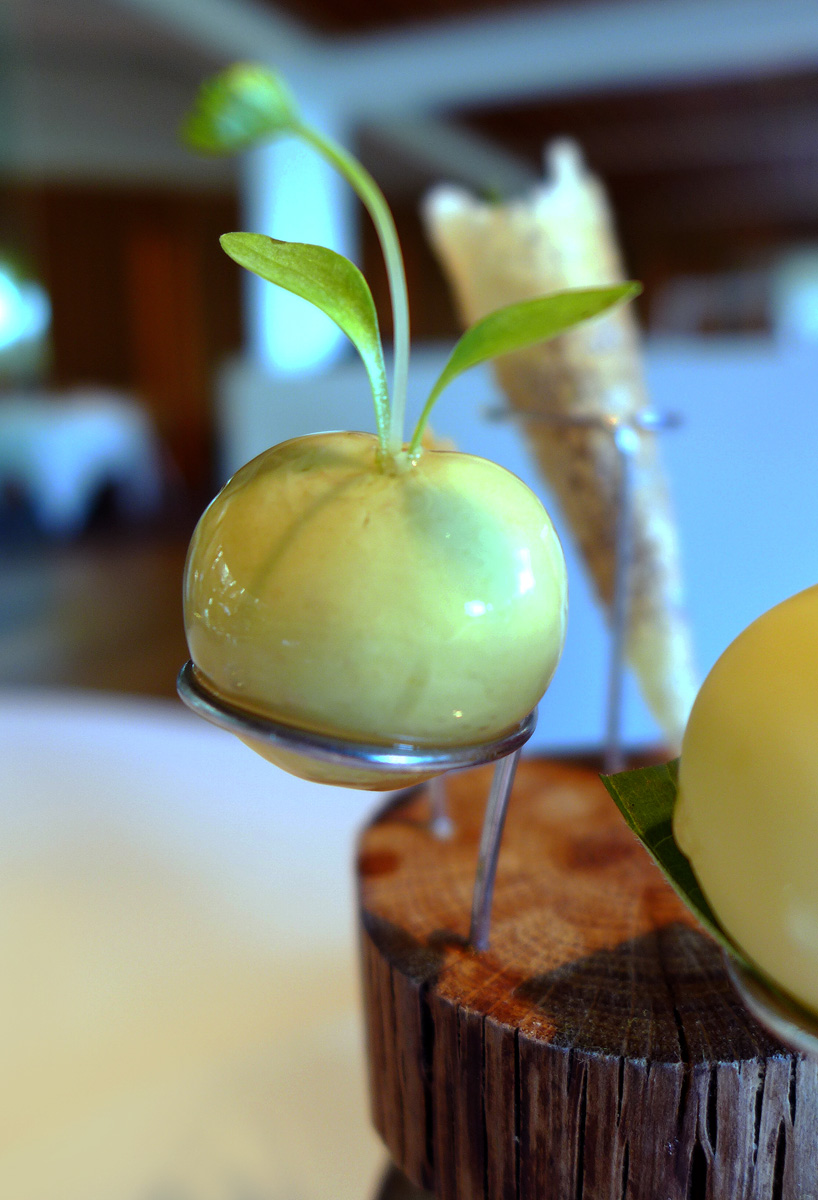Mexico – Guacamole , Tomato seed , Tomato water and Coriander. – Designed to be eaten in one bite and contains an explosion of semi liquid Mexican flavours.