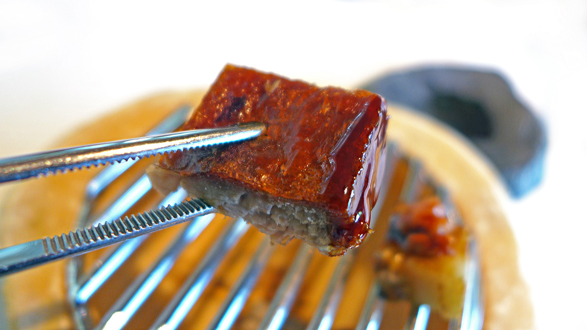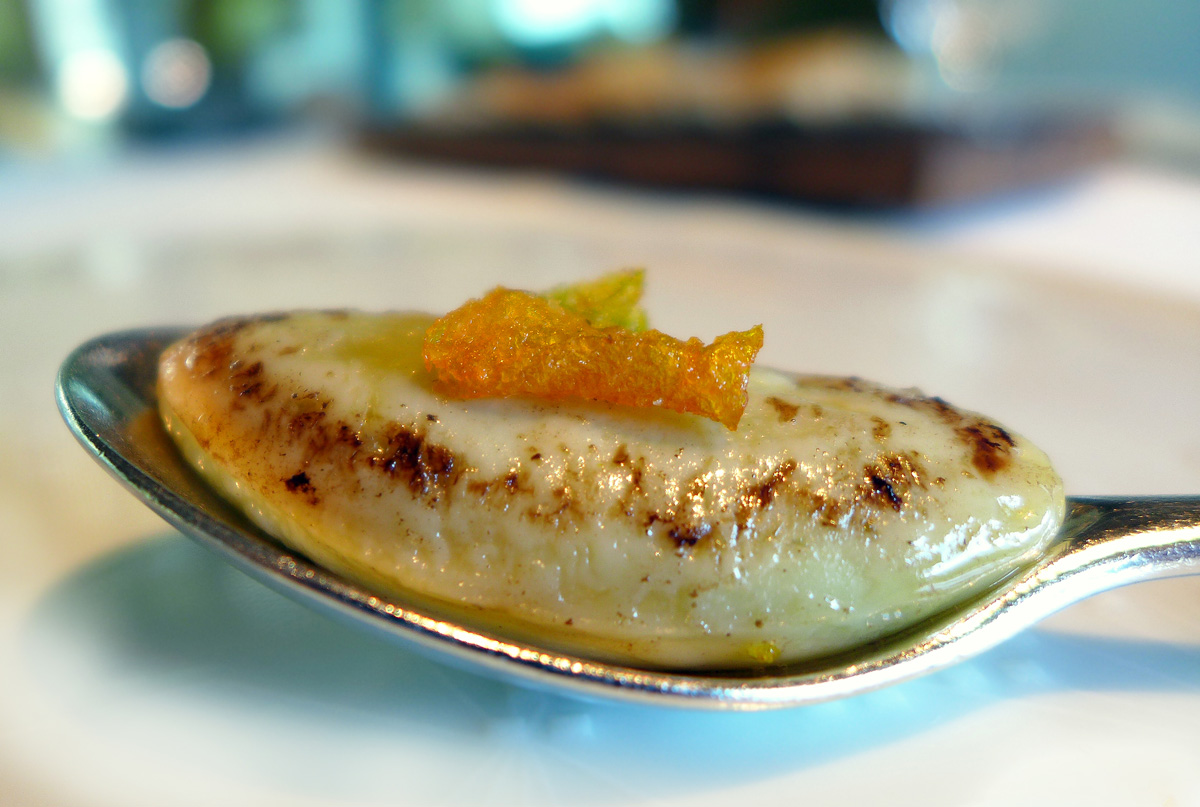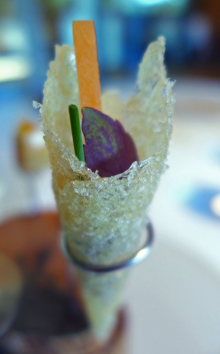 Caramelized Olive / Anchovy – This is a regular that the diner will always experience at Can Roca. Real minature Olive trees with “pick your own” fruit hanging from the branches. The olives were both sweet and salty being stuffed with Anchovy fillet and then encased in a wrapping of Caramel…. certainly different and raised a smile.