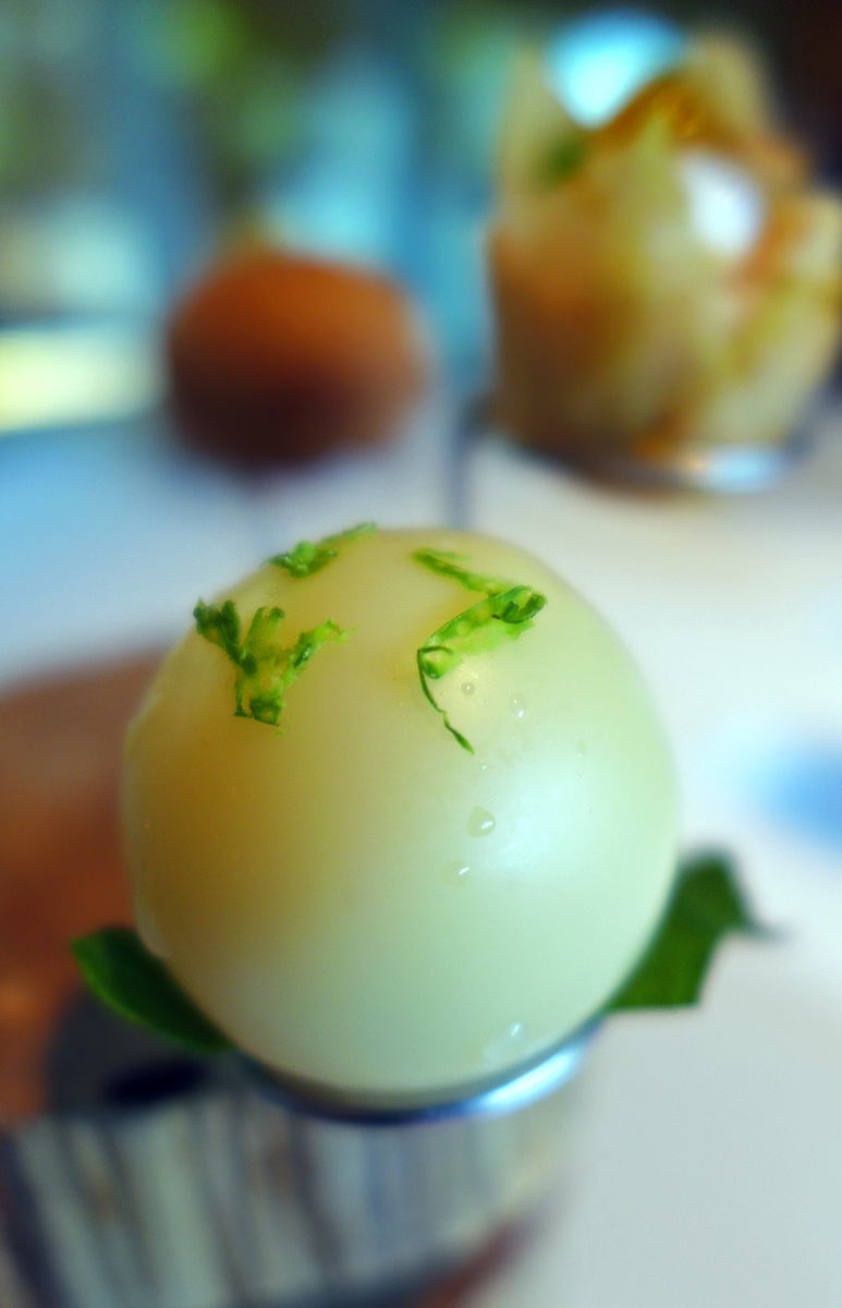 So our tasting menu begins with “The World” – A paper lantern representing the globe is dramatically opened up in front of the diner to reveal a mini planetarium of nibbles from around the World.