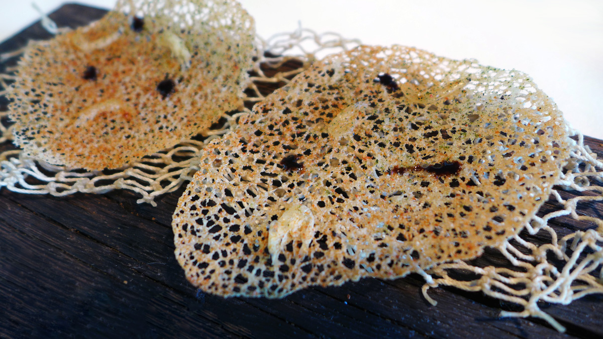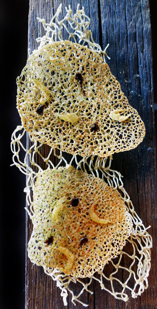 Crispy Shrimp – Little wafers on a fishing net . I`m not entirely sure what the seasonings were on these but if you look closely then you`ll notice the tiny shrimps and various sprinklings.