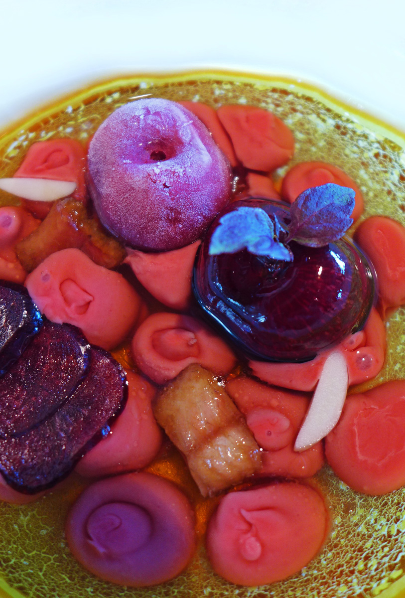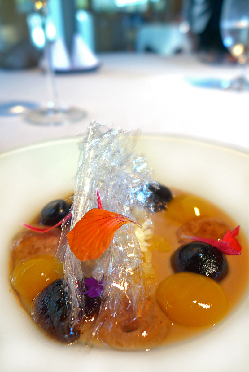 Elderflower infusion , Cherries with Amaretto , Gingered Cherries and Smoked Eel. – Cracking dish with a heavy Cherry flavour. Little bites of Smoked Eel to bring a very slight savoury transformation to what would have otherwise been a divine dessert. The Cherry was magically filled with a Ginger ice cream and then frozen. Cherry gel was piped into the Cherry consomme liquid once it had been plated up. One of the stand out courses of the meal.