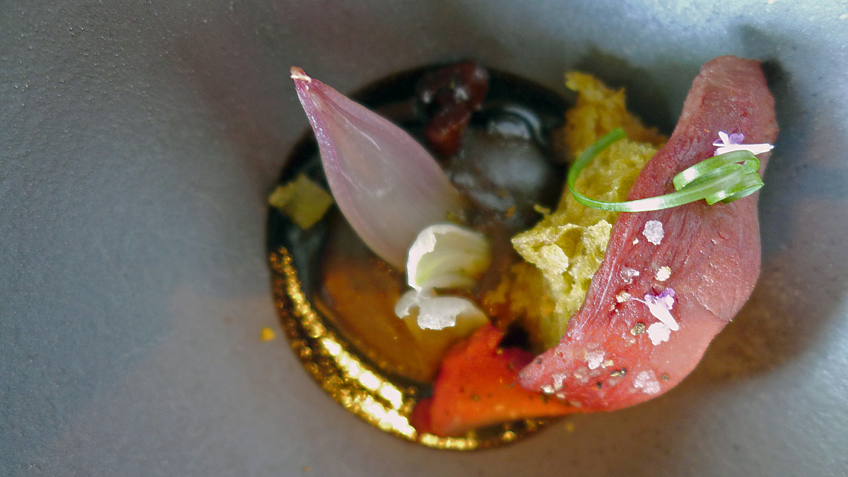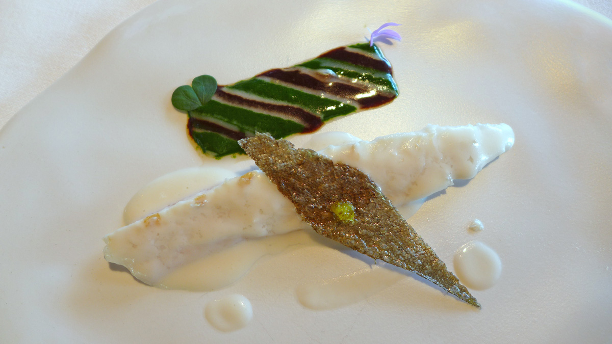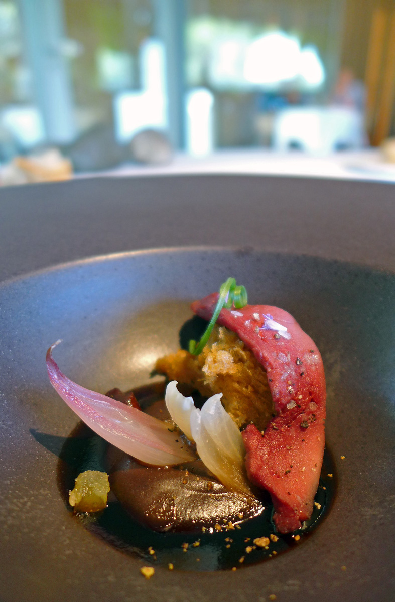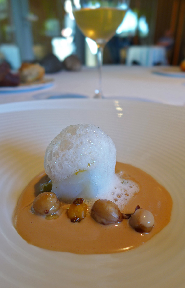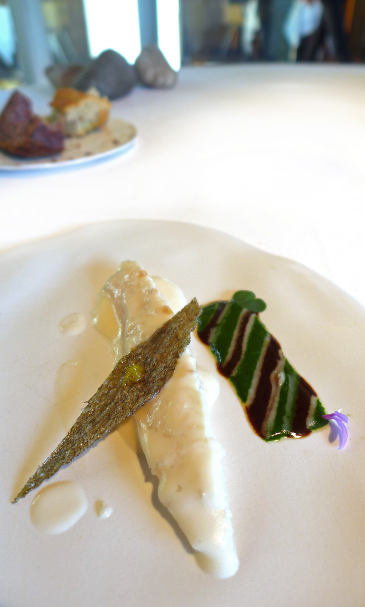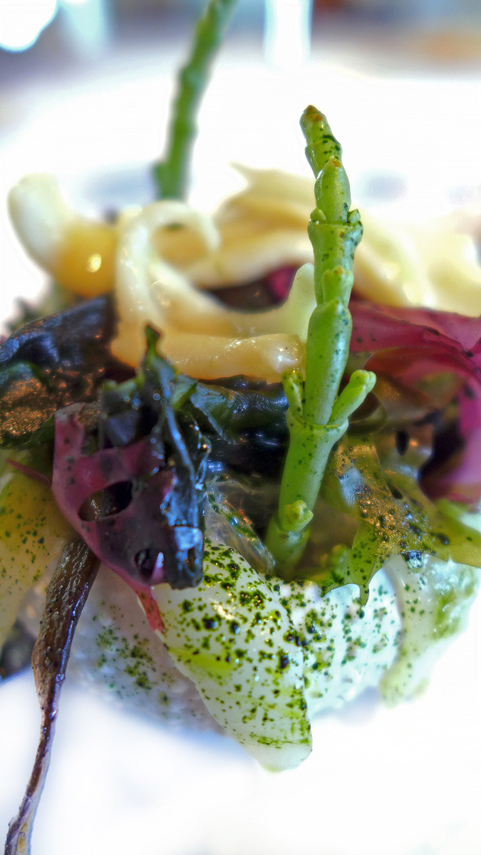 Salad of sea Anemone , Razor Clam , Royal Cucumber and Seaweed in Escabeche. This one reminded me a little of the flavours of Heston Blumenthals ” sound of the sea” a highly technical marriage of Ocean flavours and textures. Clean tastes , very fresh seafood flavourings , a sauce in the bottom of the shell made from the juices and edible seaweeds. A stand out course and one of my favourites. I think a mistake was made in the wording of this dish .. Sea “Anemone” should have been ” Urchin” as i wasn`t aware that the former were edible….correct me if i`m wrong folks.