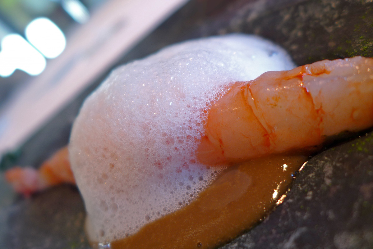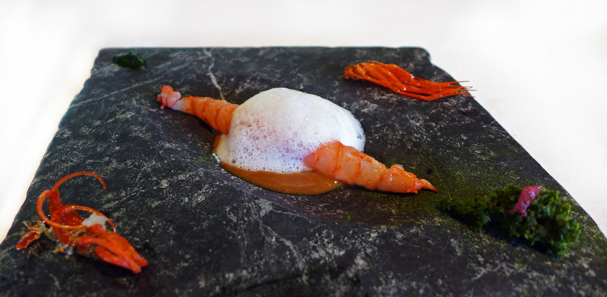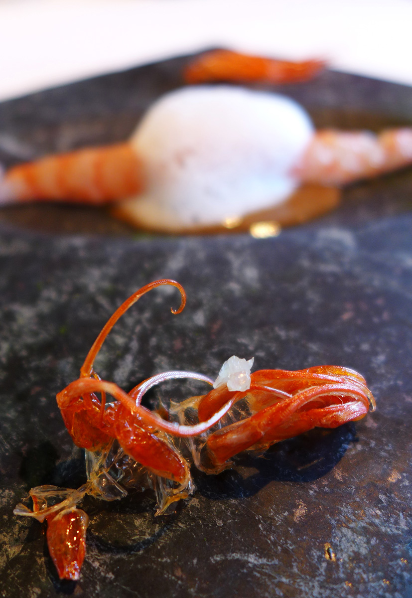 “A whole Prawn” – Charcoal grilled King Prawn , head juice with Seaweeds , Seawater and Spongecake of Plankton. – Barely cooked and very soft , sweet Palamos Prawns presented with their “Head Juices”. Nice flavours here and the highlight for me was the Crispy legs and carapace.