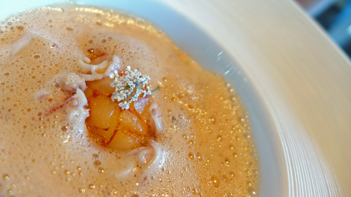 Calamari parmentier with smoked Paprika and Calimari broth. This was my sons and an alternative dish to my course as it contained Hazelnuts.