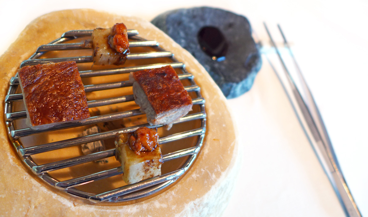 Charcoal grilled Lamb breast fillet and Sweetbreads with Eggplant , Coffee and Liquorice. – Beautiful ” two” bites of heavely flavoured Lamb breast coated in a laquer of Lamb reduction scented with Coffee and Liquorice. Crisp skin , soft smokey meat and the most amazing dipping sauce….Sat above glowing embers but only the 2 bites , i could have eaten a full plate of this wonderful food.