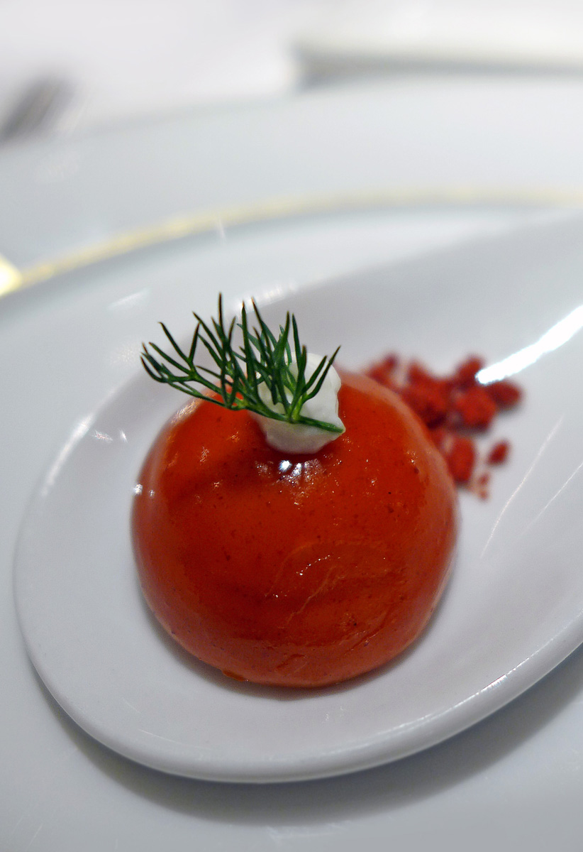 Semi sphere of pickled Tuna and Tomato sand. – A one bite liquid burst of very Tomatoey flavours.