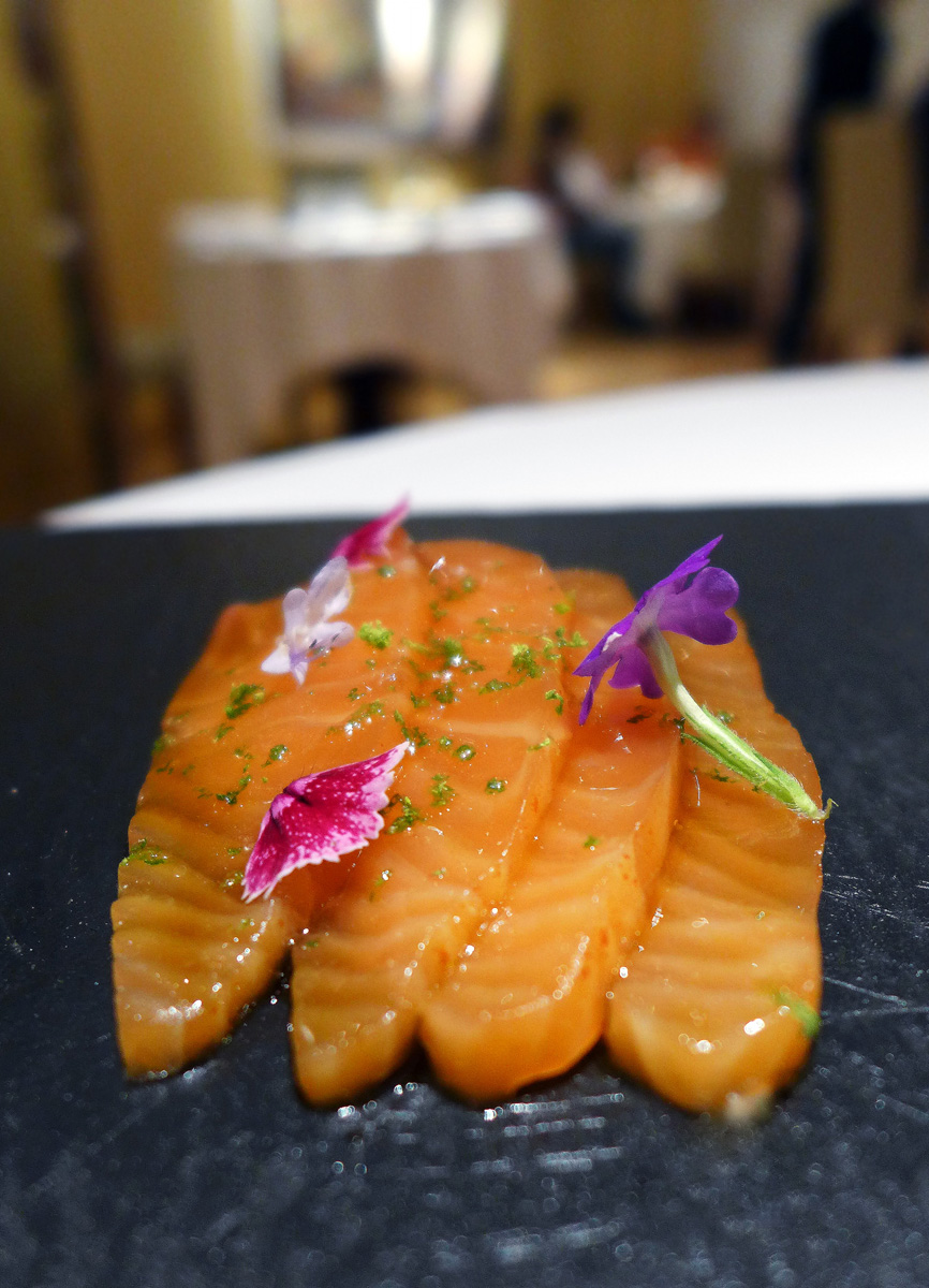 Smoked “at moment” Norwegian Salmon with Citrus and Ponzu sauce. – Really fresh slices of Salmon which were smoked very gently prior to leaving the kitchen. These were served covered in Bell Cloche jars and uncovered at the table perfuming the whole restaurant of fresh smokey Oak aromas.