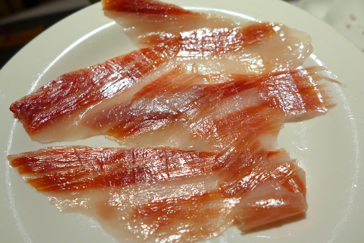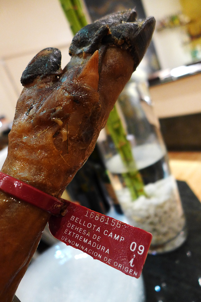Iberian Pork Ham ,”Dehesa de Extremadura” 2009 reserve ( From the Black Acorn fed Iberian Pig ) – Chef Massana smiled as he walked out of the restaurant and over to the leg of Jamon with his serrated knife.Affter slicing off a small plate of ham he came over to our table. This Ham was available as a starter for 25 Euros but Chef sensed that we were both here because we genuinely love our food and would appreciate this wonderful taste of Spain on a plate. This was the very best 4 year old Jamon Iberico that money could buy….and a little gift from the kitchen. The flavours were very creamy and fragrant and the ham fat just melted in the mouth . A normal Jamon would take between 18 and 24 months to reach its curing maturity. This ` reserva ` was 48 months of age….Beautiful.