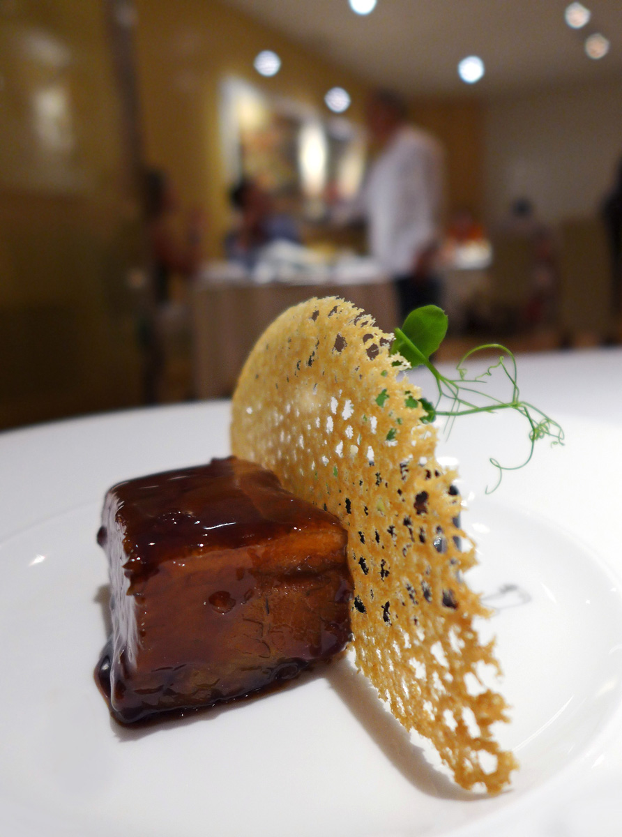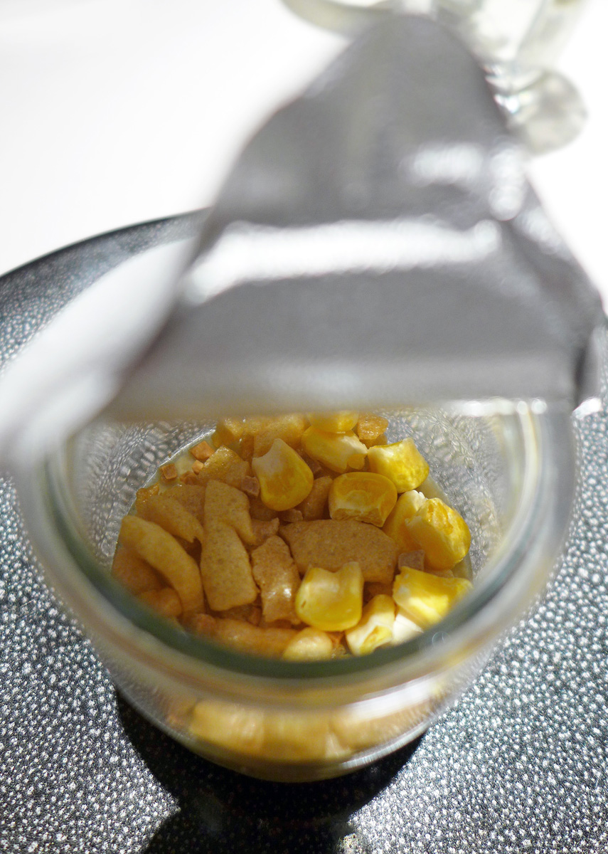 Yogurt Foie Gras as a Royal with Muscat Jelly , Crunchy Corn and Toffee.- One to eat very slowly and definitely one small spoonful at a time..with a sip of Sauternes wine in between. Creamy Foie gras and Sauternes are simply one of lifes greatest gastronomic marriages and one of the best combinations of food and drink anyone will ever experience on this planet.