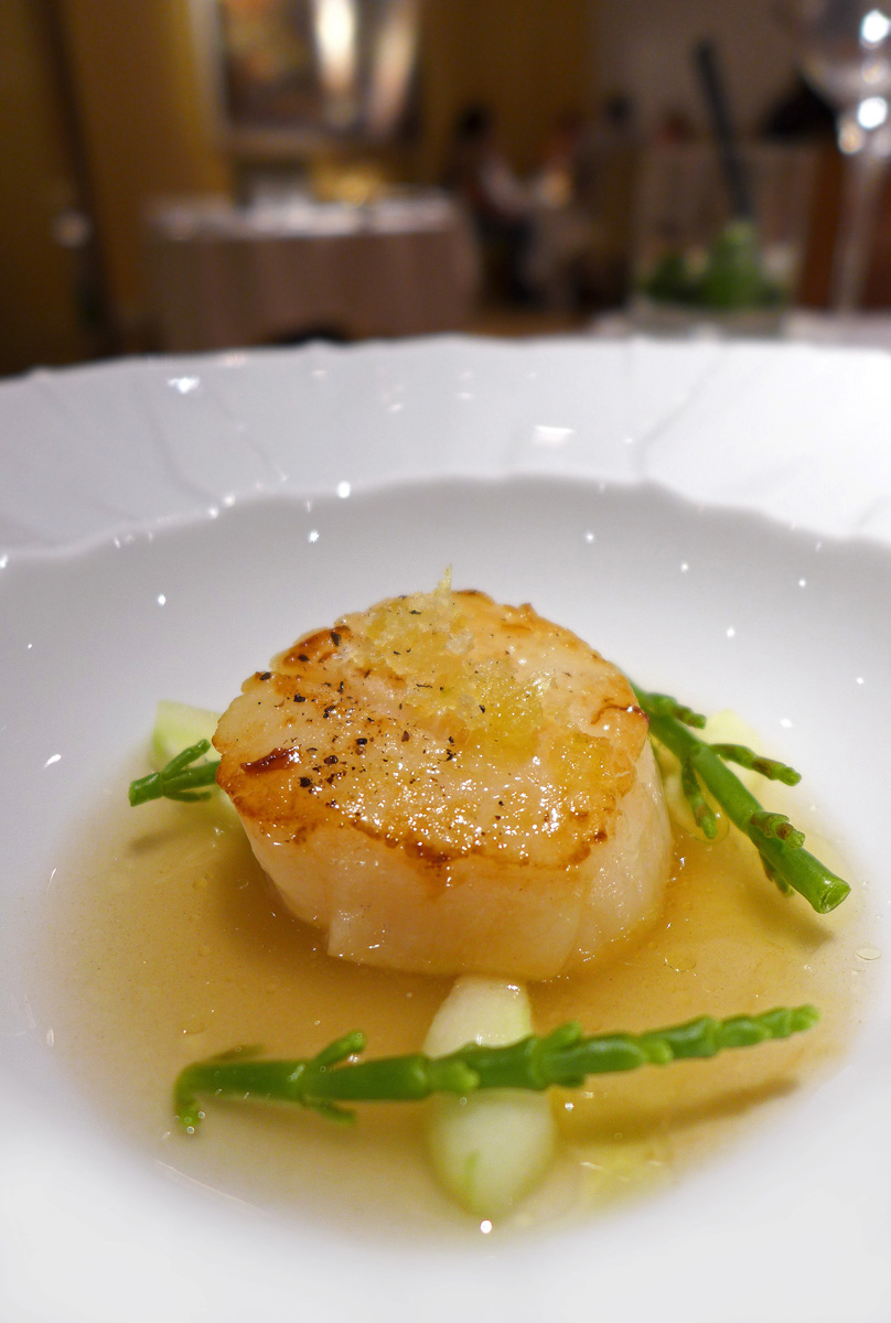 Roast Scallop , Cucumber , Lemon and Dashi broth. – Well cooked large Scallop with a delicate perfumed broth and flavours of Citrus.