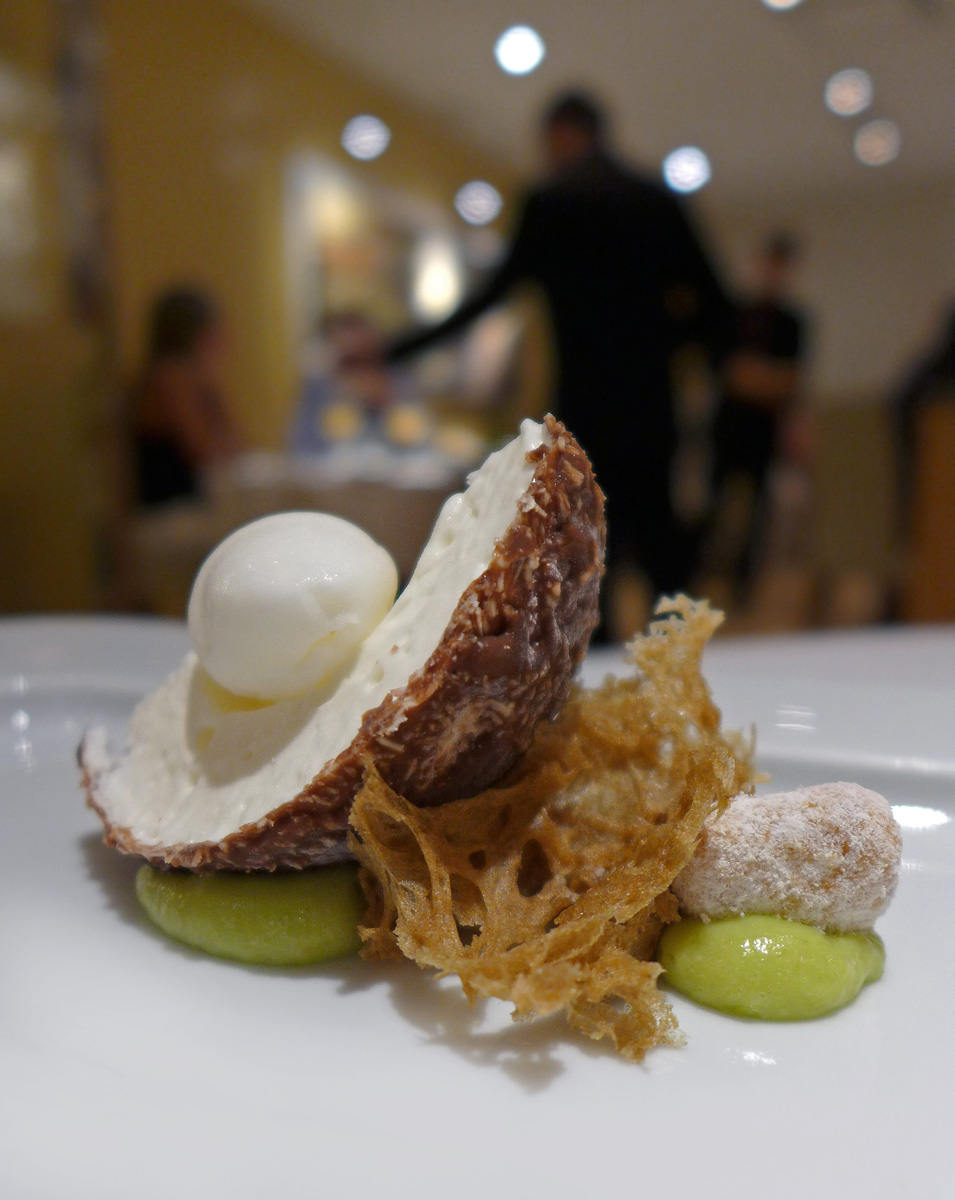 Coconut , Banana Guacamole , Sugarcane and Pina colada ice cream. – And so on to the desserts and my favourite part of the meal. This one didnt disappoint at all.The Pastry chef was rather creative in this dish of a realistic looking Coconut in a chocolate coconut shell with Pina colada flavoured ice cream sitting on top. The Sugarcane sponge and the Guacamole Banana sauce or whatever it was all went really well together.