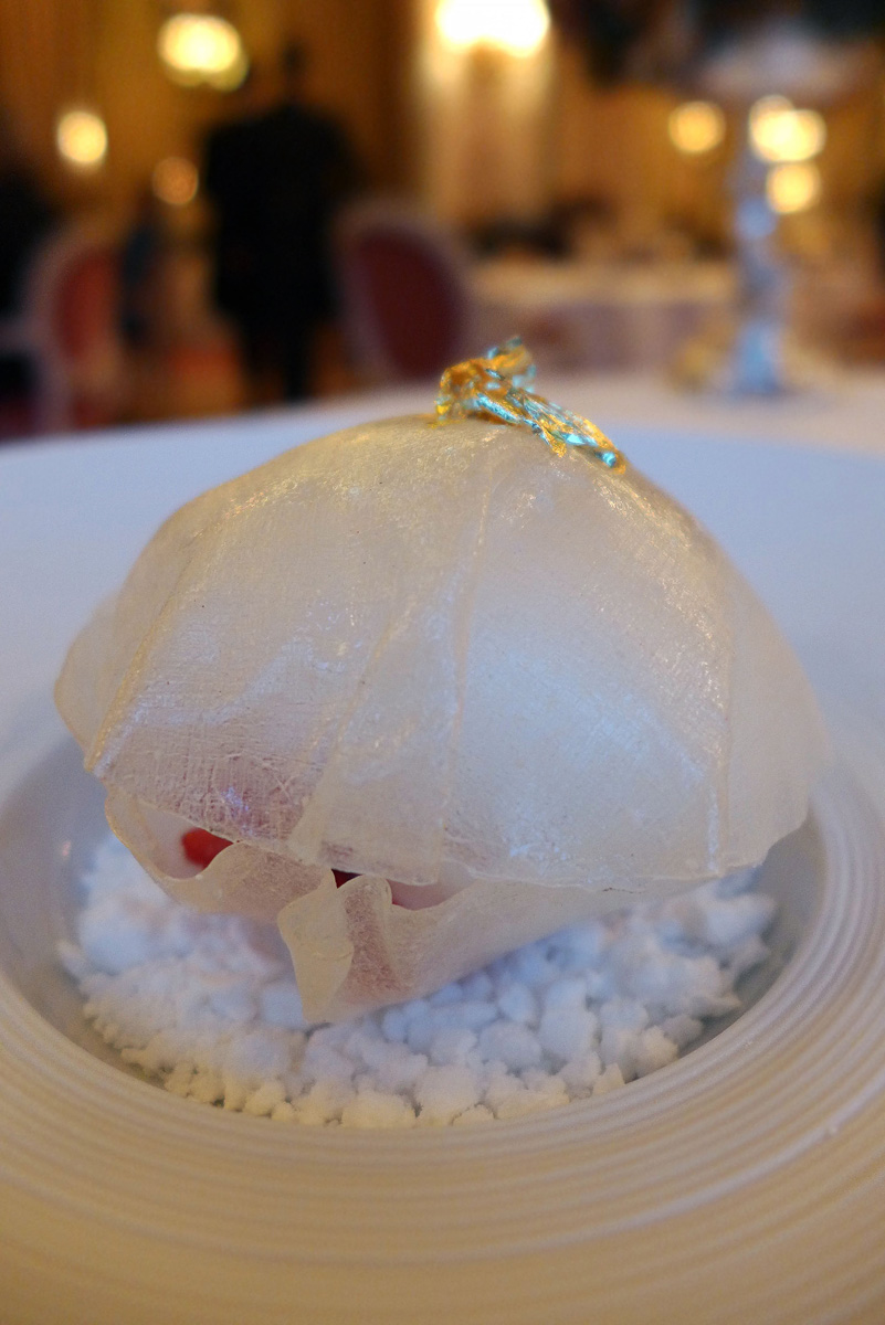 Champagne sorbet , sugar shell , gold leaf – The delicate sugar shell was removed to reveal a quenelle of sorbet.