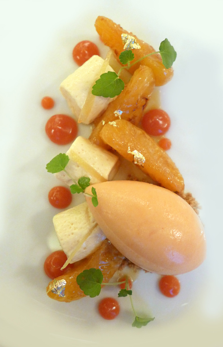 Clementine – Seared, sorbet, parfait, peel, marmalade and Gold.