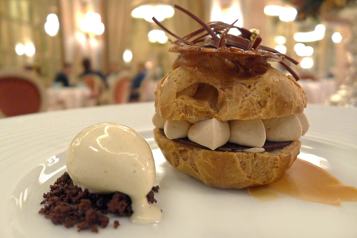 Praline , choux pastry , Caramelised nut brittle – Lewis the pastry chef was having a laugh. This was a full size Choux bun , a big dessert and filled to the max inside with Chestnut cream…..we sat and ate in silence at this stage.