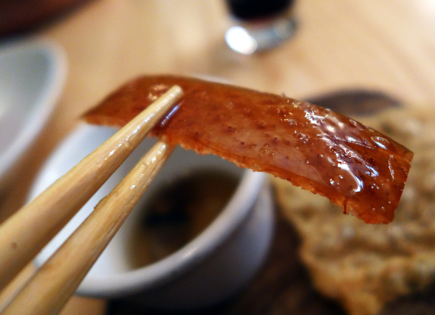 A few little nibbles arrive whilst we get comfortable and my first ever experience of eating Jellyfish. I have to admit that I was pleasantly surprised .Ever so slightly fishy but with an amazing crunchy texture….I`m won over with this one for a start.