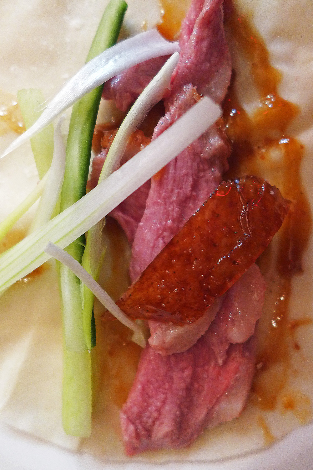 The third serving was Duck meat and more of the skin with pancake, Plum sauce, Spring Onion, Cucumber stick and minced Ginger. The Duck was pink and extremely tender and had been expertly carved into the traditional “108” slices utilising every bit of the Duck….Not an easy task for the chef. Andrew said we could count slices if we wanted but it had already been done.